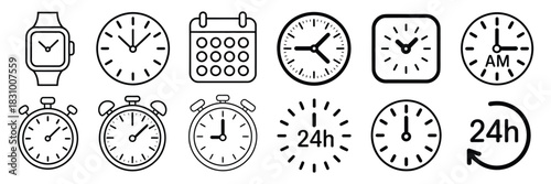 Time And Clock Icons Set Featuring Horizontal Collection Of Analog Clock Symbols, Circular Arrow Elements, And Minimal Clean Design Rendered As Modern Line Style Illustration For Interface Use