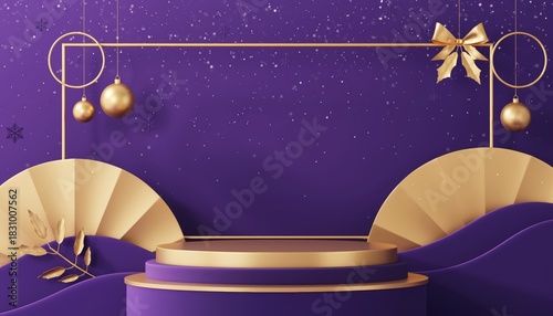 Elegant holiday display with gold accents festive setting 3d rendered visuals purple background studio lighting seasonal celebration theme