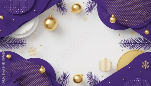 Festive holiday decoration home space graphic design colorful environment aerial view creative concept featuring purple and gold elements with ornaments