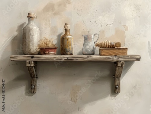 Rustic Still Life: A collection of vintage bottles, a pitcher, and other decorative items sit on a weathered wooden shelf against a textured wall.