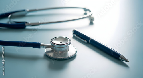 Healthcare Professionals Wellness A Symbol of Doctor's Trust in Medicine and Diagnosis Doctor Stethoscope and Pen on Light Blue Table in Hospital for Health Care Concept