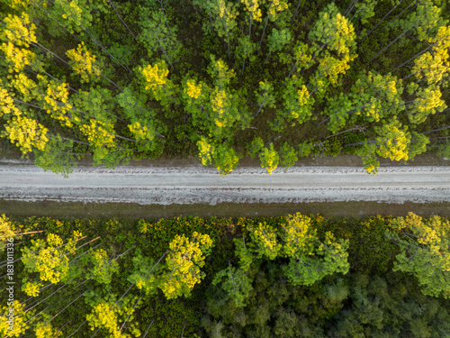 sandy road at sunrise - Apalachicola National Forest in Florida, aerial view