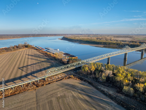 bridge and barges on the Mississippi River at confluence with the Ohio River below Cairo, IL, November aerial view