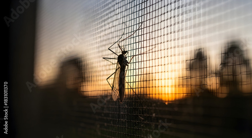 Sunset Silhouette A Mosquito on a Screen Door as Dusk Arrives Protection from Disease Carrying Insects During Warm Weather A Moment of Summer Health Awareness
