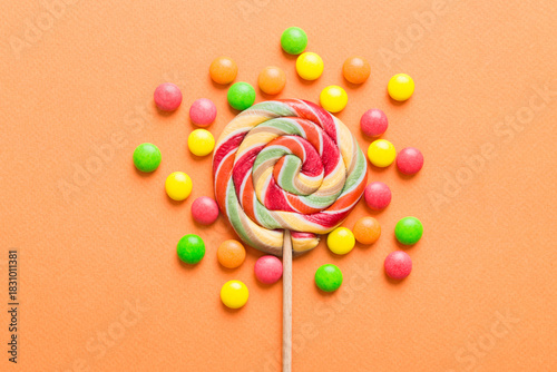 Tasty appetizing Party Accessories Happy Birthday Sweet. Different types of candies on colored background, copy space. Colorful birthday party background
