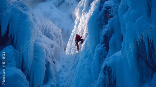 Dramatic view of ice climber ascending a sheer frozen waterfall with an ice axe.
