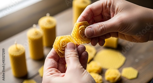 Crafting beeswax candles with intricate flower patterns in a warm light