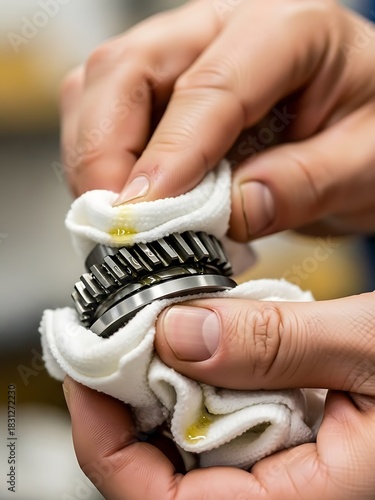 Detailed cleaning of metal gear wheel with a soft cloth for maintenance