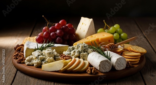Elegant cheese board display with grapes, honey and walnut accents, on wooden table