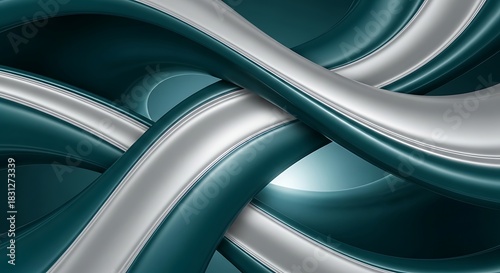 Modern dynamic interplay of wavy, reflective shapes with metallic touches