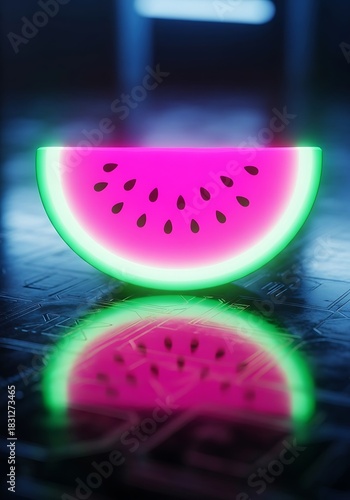 Neon watermelon slice shimmering atop a circuit board surface with reflection