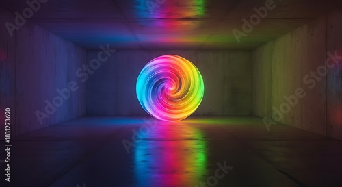 Radiant spectrum sphere in a concrete room with mesmerizing reflections