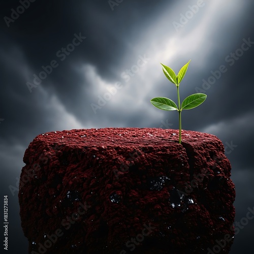 Resilient sprout amidst storm clouds on an eroded earth pedestal concept