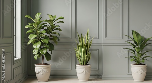 Tranquil indoor foliage arrangement against muted decorative paneling