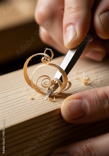 Woodworking chisel sculpting a curl, delicate craftsmanship and precision