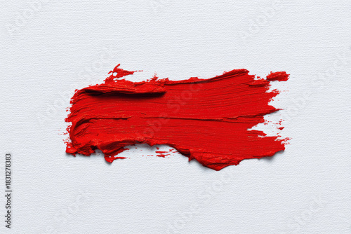 Lipstick smudge swatch in vibrant red color with textured top view on white canvas background creating bold and artistic impression