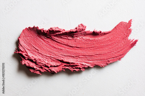Lipstick smudge swatch in vibrant pink shade displayed from top view on white textured background showing creamy texture and bold color