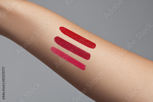 Lipstick, smudge, swatch, top, view Three lipstick swatch lines in red and pink shades create bold smudge effect on forearm, shown from top view against neutral background
