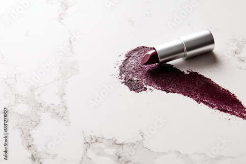 Lipstick smudge swatch on marble surface with top view showing rich color and creamy texture for beauty and makeup inspiration in modern setting