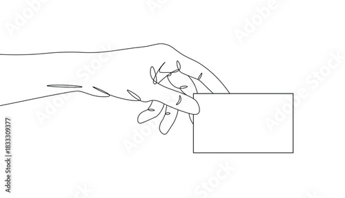 Minimalist line art illustration of a hand holding a rectangular object or card, drawn with dashed lines