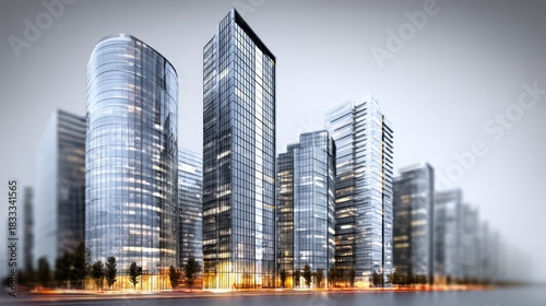 City skyline with tall buildings and a few trees. The buildings are mostly glass and the sky is cloudy
