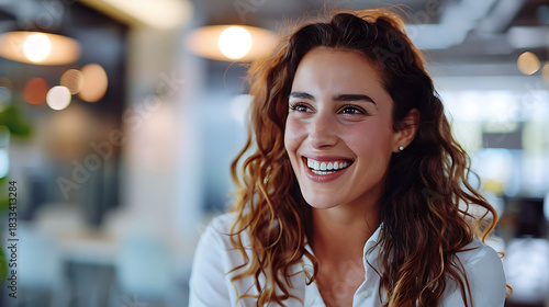 woman smiling warmly while greeting a client, bright interior lighting, clean white-and-wood office style, trust-building composition