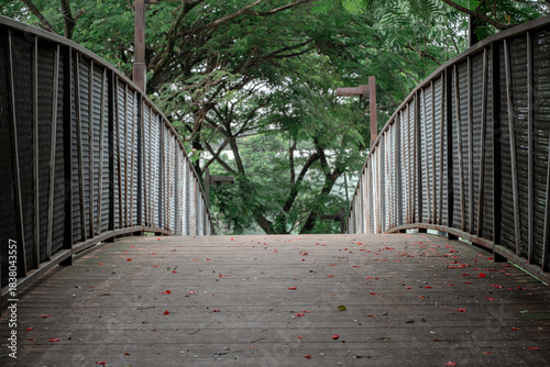 Perspective view of a pedestrian bridge with wooden flooring scattered with red Delonix regia petals.