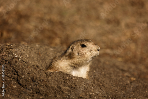Prairie dog emerging from a burrow in sunlit dry soil