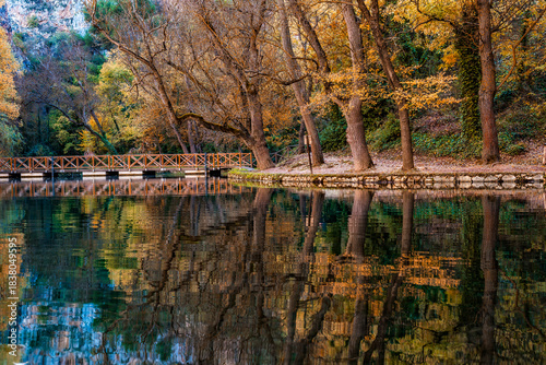 Monasterio de Piedra lake reflecting autumn trees and bridge