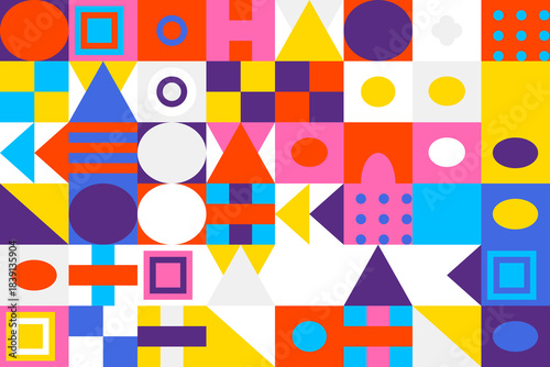 Vibrant geometric abstract pattern with playful shapes and bold colors