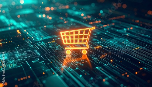 発光するショッピングカートがECネットワーク上でデジタルに輝く構図