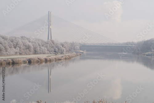 Most Rędziński we Wrocławiu zimą na tle rzeki Odra