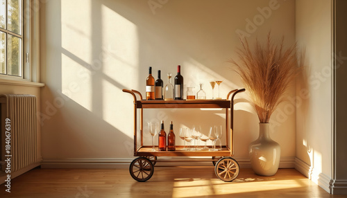 Wooden bar cart with wine bottles and wine glasses in a sunlit room. Bar cart on wheels has two shelves with glasses and bottles. Decorative vase with dry plants stands nearby on wooden floor.
