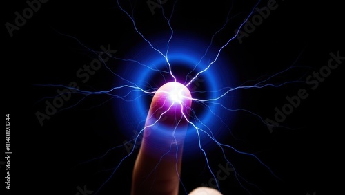 A finger touching a glowing orb of light, creating blue electrical discharges against a black background.