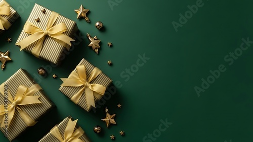 A festive flat lay of gold gift boxes and stars on a deep green background for holiday celebration