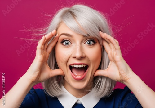 Excited young woman with platinum blonde hair screaming in surprise or joy, hands framing her face.