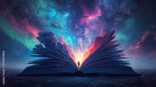 Illustration of a man standing in front of an open book with magic effect. Abstract background for World Poetry Day