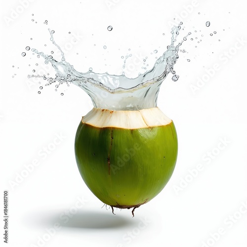 Green coconut bursts with refreshing water splash. Liquid droplets fly, creating dynamic motion. Isolated tropical fruit, pure hydration refreshment.