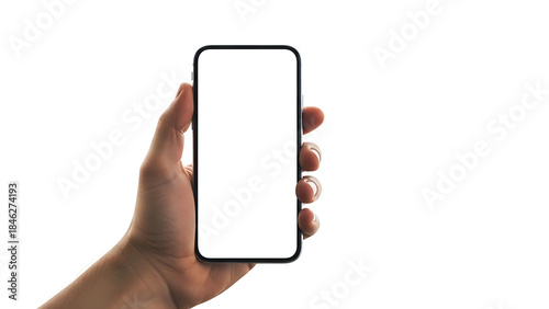 A person's hand holds a modern smartphone vertically, showcasing a blank white screen for mockup purposes.