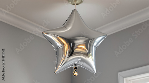 Star-Shaped Balloon Floating Elegantly: A shimmering star-shaped balloon, a symbol of joy and celebration, suspended gracefully from the ceiling, its metallic surface reflecting the surrounding light.