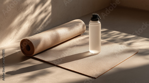 minimal yoga mat and water bottle in soft sunlight, calm wellness still life with yoga mat, mindful fitness concept with yoga mat and hydration