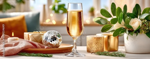 New year celebration scene with champagne glass, candles, gifts, and festive greenery on a cozy table