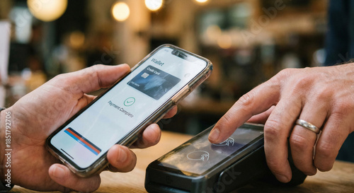 Customer completing a contactless mobile payment using a smartphone digital wallet at a point of sale terminal. Cashless transaction with tap-to-pay technology in a modern retail environment