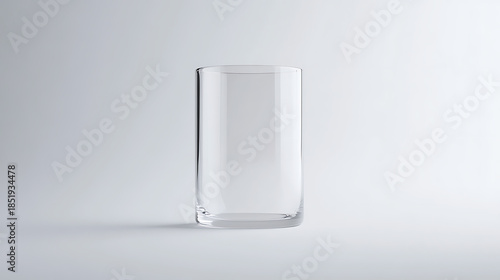 A minimalistic still life captures a clear, cylindrical glass on a soft gray background. The sleek design emphasizes simplicity & form, highlighting the object's transparency.