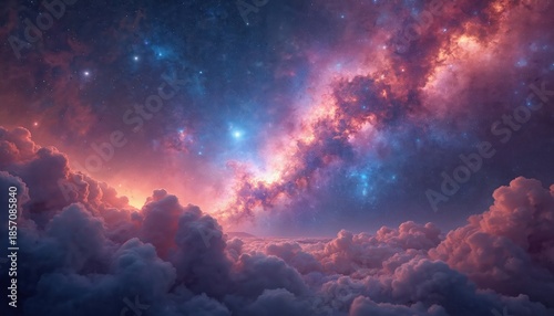 Colorful nebula and clouds fill starry night sky. Dreamy cosmic space scene with pink orange and blue light. Outer space exploration fantasy background.