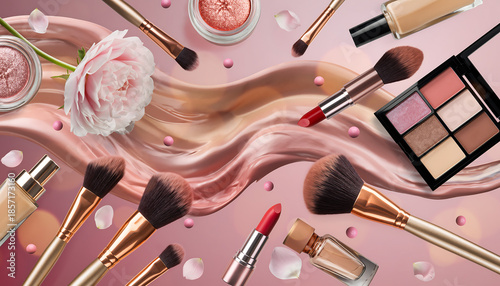 Productos de Maquillaje Cosméticos Belleza Fondo Rosa Brochas Paleta Labial Sombras Elegante Femenino