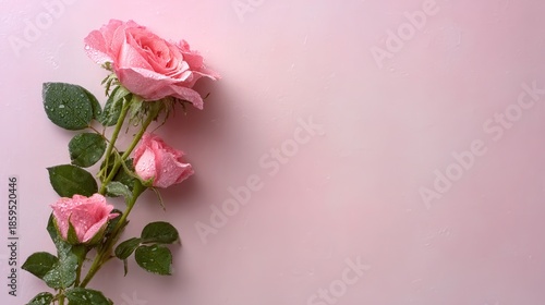 Top-down view of pink spray rose with dewdrops and copy space on soft pastel background, elegant floral composition for greeting cards and romantic design.