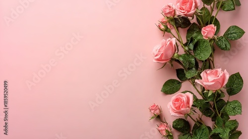 Top-down view of pink spray rose with dewdrops and copy space on soft pastel background, elegant floral composition for greeting cards and romantic design.