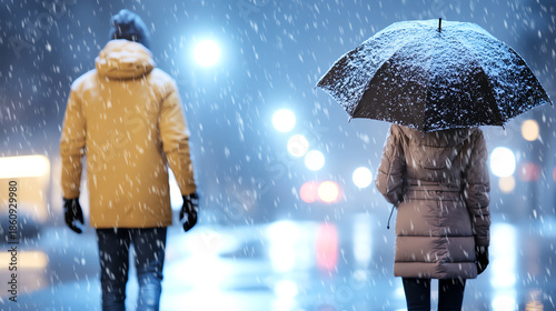 A couple walks in a snowy street, sharing a quiet moment under the glow of city lights and falling snowflakes.