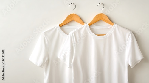 Two plain white t-shirts hanging on wooden hangers against a light background, showcasing simplicity and versatile fashion.
